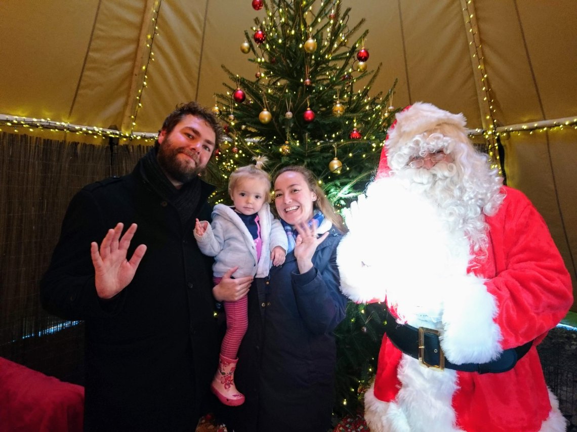 Back at the base, it was time for us to visit Santa’s Grotto. The route was marked by brightly coloured signs and cut out characters perfect for a Christmas selfie stop. Two joyful elves showed us the way into the Christmas courtyard where a woodland fire roared and a large teepee took centre stage. Inside the teepee a huge Christmas tree adorned with baubles and fairy lights took our breath away.